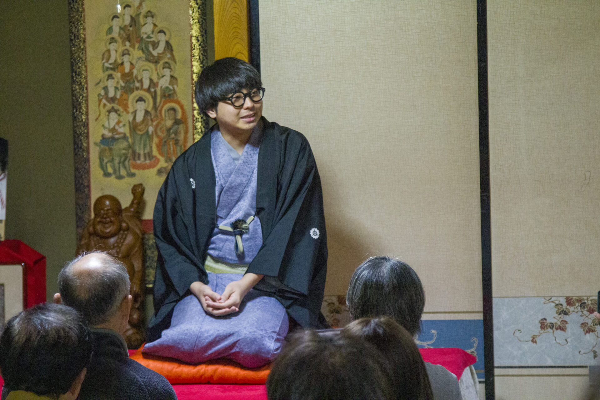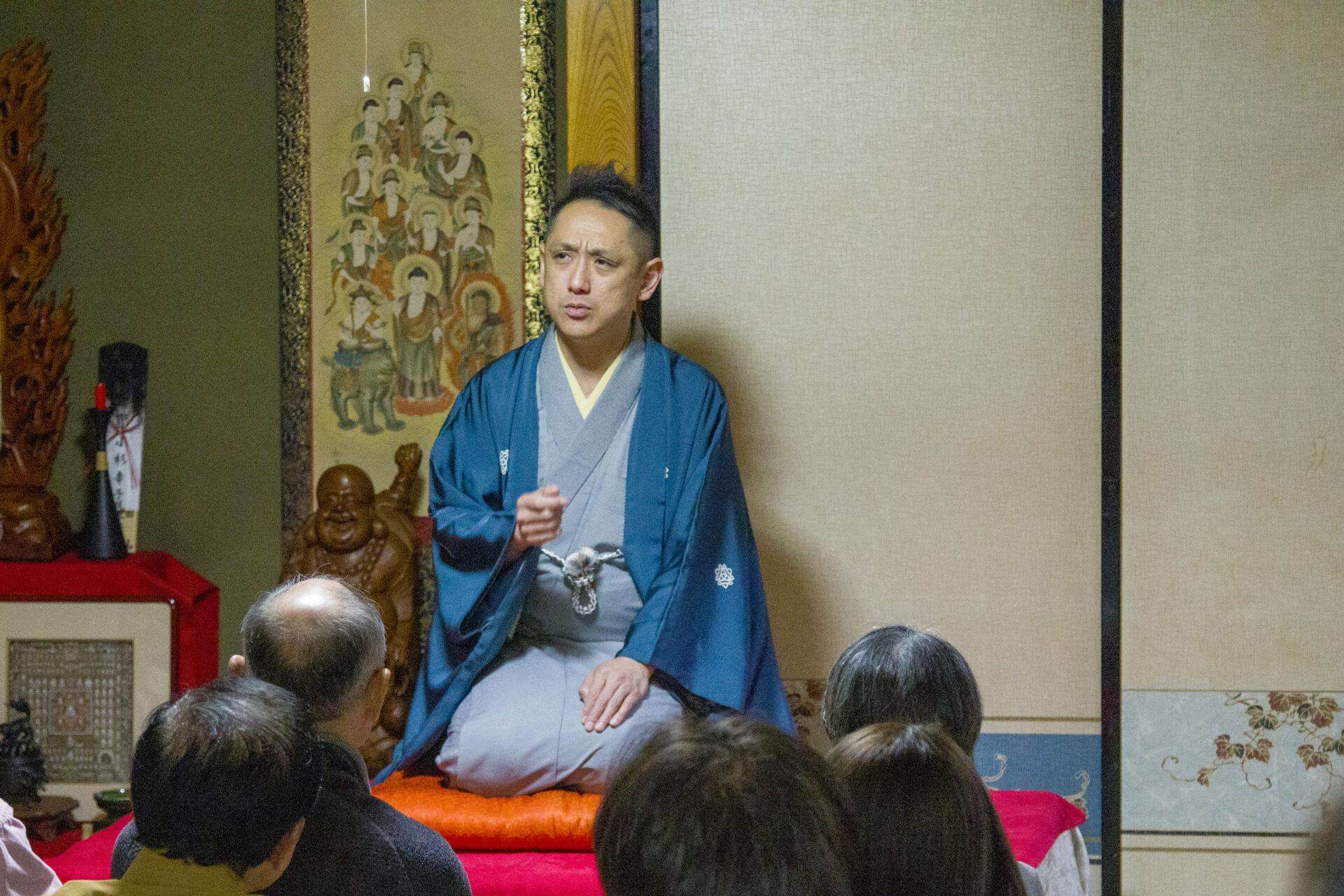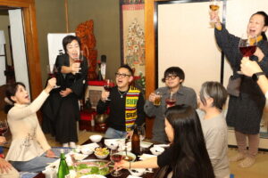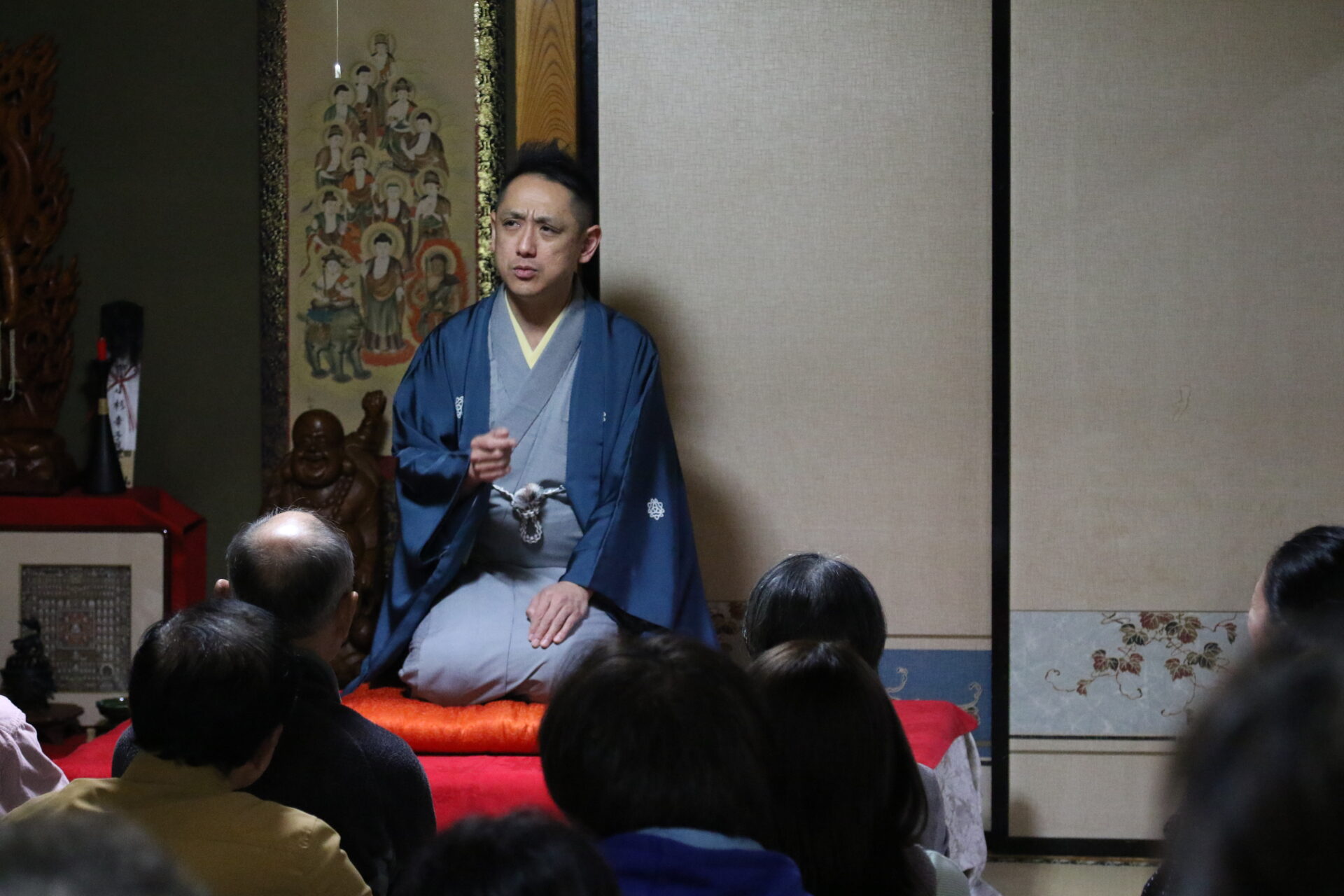 今年2月、7代目を襲名した円楽さんと、全国のコミュニティFMで金曜日深夜に放送中の「円楽のシネマトーク&ミュージック」で小杉幸子さんがパーソナリティを務め、プライベートでも交流。小杉さんの祖母で中嶋屋旅館の創業者、阿部シゲノさんの50回忌の供養として落語会を開催したいとの思いを伝えたところ、円楽さんの快諾で「第1回石打丸山スキー場関山寄席『七代目三遊亭円楽落語会』」が実現。落語会には、小杉さんの親戚や地元住民、地元企業のオーナー、議員ほか、首都圏からのメディア関係者ら総勢約50人余りが落語を満喫。引き続き、円楽さん、弟弟子の萬丸さんを囲んで地元「天心」の自慢料理や近隣住民の持ち寄った酒を酌み交わしながら交流を深めた=写真=。