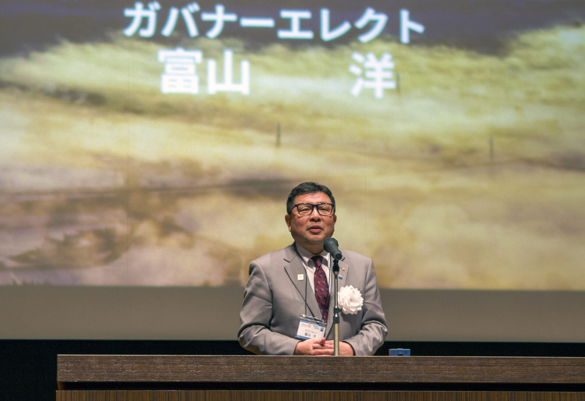 ガバナーエレクトの富山洋さん(64・富山電気社長)は「私は、ロータリー会員であること自体が素晴らしい価値を持ち誇りである。人の生きがいとは『人の役に立つこと』と思っている。各地域で実業や専門職に